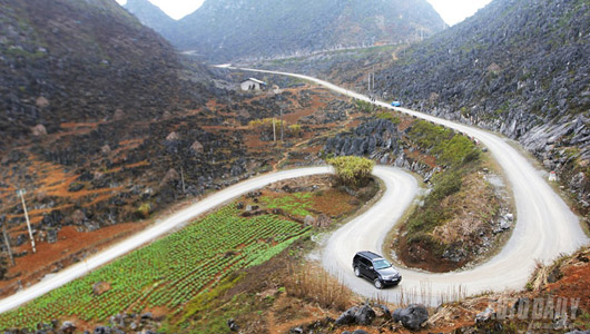 Đường cứ uốn quanh hết ngọn núi này đến ngọn núi khác, khi lên thì như lên tới trời, khi xuống thì như xuống vực thẳm. Lái xe lúc này vần vô lăng không ngơi. Thi thoảng đoàn xe mới bắt gặp một bản làng, một cánh đồng hoa bạc hà dưới chân núi hay một vườn cải trổ hoa rộng mênh mông trải ra như thảm vàng dọc theo con đường. Đường khó đi thế nhưng cũng thơ mộng là thế.